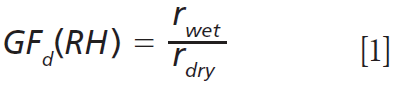 The changes in radius and RI can be visualized in a plot of radial growth factor (GFd) against droplet RI or RH. Any droplet will have a well-defined relationship between real RI and RH, owing to the relationship between RI and solute concentration, provided the droplet chemical composition does not change beyond water uptake or loss in response to changes in ambient RH. This relationship leads to a defined trajectory between droplet RI and droplet wet radius (rwet). However, dry particle radius, rdry, will vary from measurement to measurement. A plot of radial growth factor [GFd(RH)] accounts for variations in particle dry size by defining the change in rwet relative to rdry: