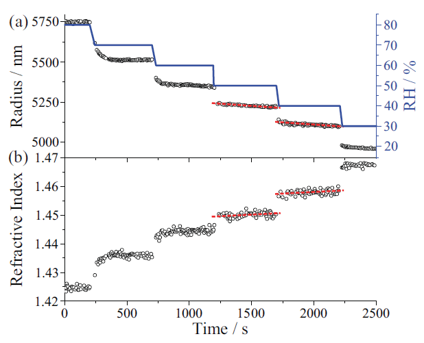 Figure 4: Response of a glycerol droplet to changes in ambient relative humidity (RH). Changes in whispering gallery mode (WGM) position are used to quantify changes in (a) droplet radius, and (b) refractive index (RI). The red dotted lines indicate the loss of semivolatile glycerol during periods of constant RH.
