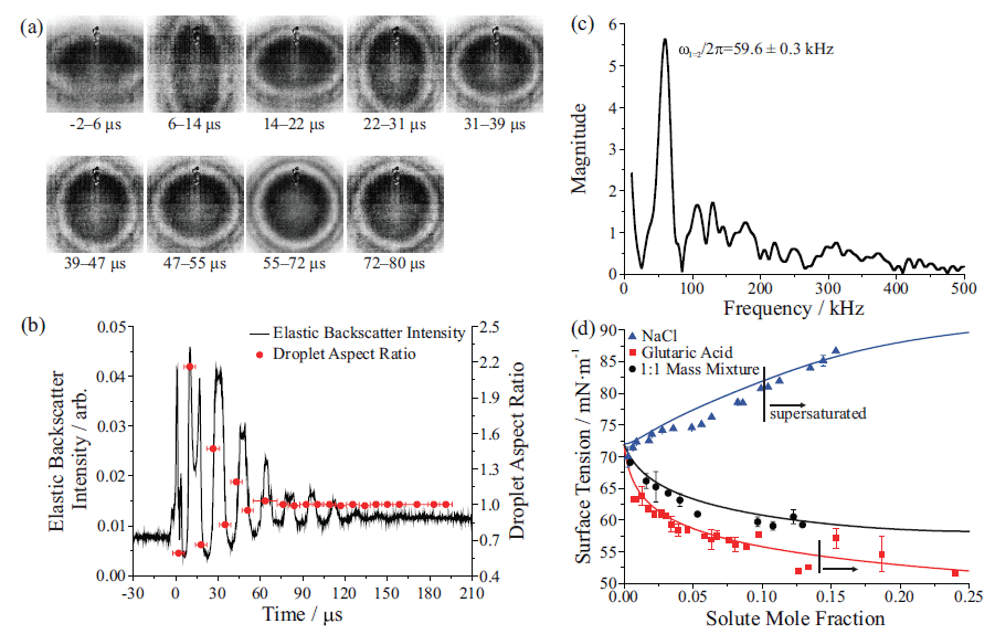 Figure 6: (a) High frame rate images after coalescence of two aqueous, surfactant-doped sodium chloride (NaCl) droplets. (b) Elastic backscattered light intensity collected after coalescence (left axis) and droplet aspect ratios from the images in part (a) (right axis); (c) A fast Fourier transform (FFT) of the signal in part (b) gives the frequency of the shape oscillations (8). In (d) measurements of picoliter droplet surface tension for NaCl, glutaric acid, and a 1:1 mass mixture of the two compounds (symbols) are compared to a statistical thermodynamic model of surface tension (lines) (27).