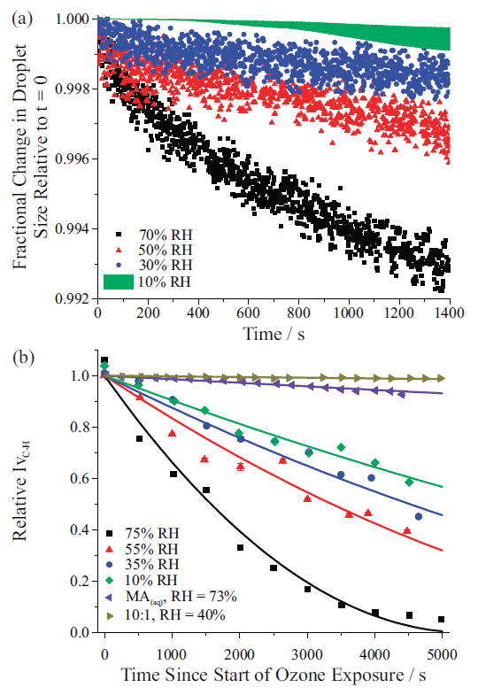 Figure 8: (a) Fractional change in droplet size over 1400 s for a maleic acid–sucrose droplet at four different relative humidity (RH) values, showing the gradual retardation in maleic acid evaporation as RH decreases. The green envelope shows the range of the data for the mixture at 10% RH (data not shown for clarity). (b) Time-dependence of the normalized spontaneous Raman signal intensity of the maleic acid vinylic C-H stretch during oxidation experiments at different RH values for a 5:1 mass ratio sucrose–maleic acid droplet. Purple triangles show change in signal intensity for an aqueous droplet evaporating at 73% RH without reaction. Gold triangles show the change in Raman intensity during reaction of a 10:1 mass ratio droplet at 40% RH (30).
