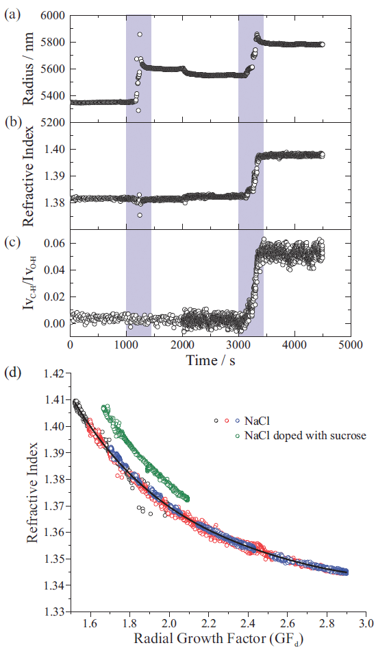Figure 5: Droplet (a) radius, (b) refractive index (RI), and (c) chemical composition for a coalescence sampling measurement. In the first coalescence window (first purple box), a flow of aqueous sodium chloride (NaCl) droplets was introduced. In the second coalescence window, a flow of aqueous sucrose droplets was introduced; (d) Comparison of the RI-growth factor (GFd) relationship for NaCl droplets (black, red, and blue) and a NaCl droplet after a period of coalescence sampling of sucrose aerosol (green) (17).