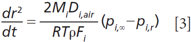 where Mi is the molecular mass of semivolatile compound i, Di is its diffusion constant in the surrounding gas, R is the ideal gas constant, T is temperature, ρ is the droplet density, Fi is the mass fraction of compound i, pi,r is the vapor pressure in equilibrium at the droplet surface, and pi,∞ is partial pressure of the molecule at infinite distance from the droplet surface (assumed zero).