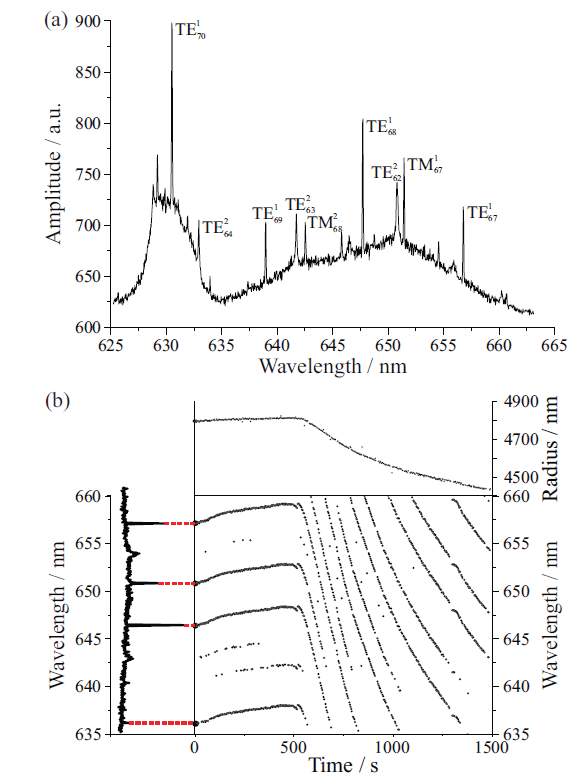Figure 3: (a) A cavity-enhanced Raman spectrum of an optically tweezed aqueous sucrose droplet. The spontaneous Raman signal centred around 650 nm is the O-H stretching vibration of water, whereas the signal around 630 nm is the C-H stretching vibration. The stimulated Raman signal is the superimposed structure on the spontaneous band; (b) whispering gallery mode (WGM) position is closely related to droplet size.