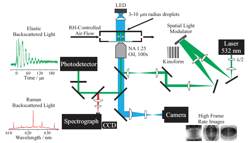 To measure individual droplet properties by spectroscopic approaches, the droplet location must first be controllable. Optical tweezers are one method to capture and manipulate 3–10 µm radius droplets over long time periods. The approach, recently recognized by the 2018 Nobel Prize awarded to Arthur Ashkin, employs a tightly focussed laser beam to create a gradient force optical trap that immobilizes a particle by exploiting the refractive index (RI) difference between the particle and surrounding medium. Optical tweezers are perhaps better known for applications to condensed systems, but in fact some of the early optical trapping work captured liquid droplets in air (5,6). Figure 2 illustrates a typical aerosol optical tweezers (AOT) setup, similar to that sold commercially by Biral, configured to allow production of multiple, steerable optical traps for the study of droplet coalescence (7,8). A spatial light modulator dynamically shapes the phase front of a continuous wave 532 nm laser to form multiple, steerable optical traps. When the trap separation is sufficiently small, droplet coalescence is induced. Brightfield imaging is accomplished by a blue LED. Backscattered Raman light is imaged onto the entrance slit of a spectrograph to perform single droplet spectroscopy. Elastic backscattered light, the intensity of which varies during droplet coalescence, is directed to a photodiode, and recorded with an oscilloscope. Droplets are typically nebulized from solution, and captured in an isolated RH-controlled trapping chamber. This approach enables measurement of a range of physical and chemical properties of an optically trapped droplet.