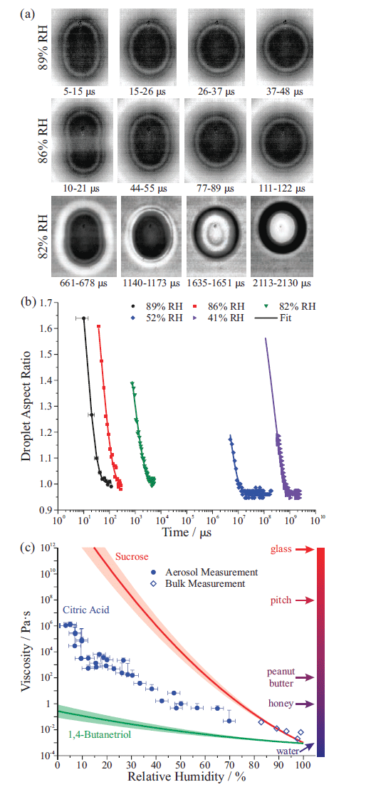 Figure 7: (a) High frame rate images of coalescing sucrose droplets equilibrated to different relative humidity (RH) values (29); (b) Droplet aspect ratios during coalescence for several droplets, each with different viscosities (28); (c) Plot of viscosity against RH for 1,4-butanetriol, citric acid, and sucrose.
