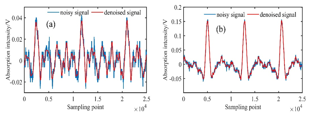Figure 4: Comparison before and after denoising of 100 ppm and 1000 ppm methane second harmonic signals: (a) Comparison of results before and after100 ppm denoising; and (b) comparison of results before and after 1000 ppm denoising.