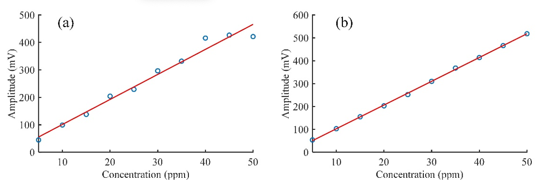 Figure 2: Undenoised and denoised methane second harmonic signal fitting: (a) Second harmonic amplitude fitting before noise reduction, and (b) second harmonic amplitude fitting after noise reduction.