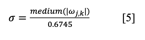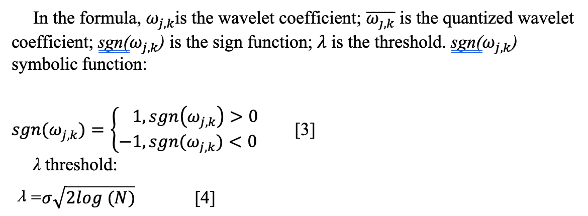 This thresholding formula was invented by Donoho (18), and the threshold λ is the upper limit of the optimal threshold, which is to a large extent the upper limit of the noise is lower than this value, so that the thresholds of each layer can be freely set according to the characteristics of the signal. The o in equation 4 is denoted as: