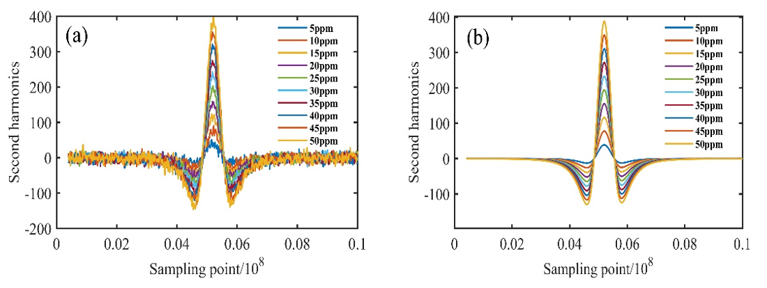 Figure 1: Spectrum of the second harmonic signal of methane without denoising and after denoising: (a)before noise reduction; (b) after noise reduction.