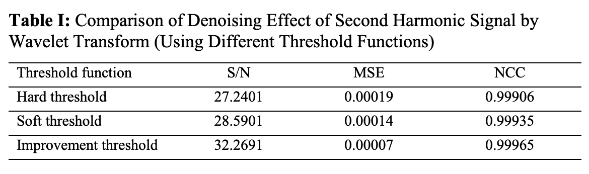 First, a 5kHz high-frequency modulated sine wave is superimposed onto a 10Hz low-frequency scanning sawtooth wave as the ideal signal. Where the period of the sine wave is 400 times the sampling period, the sum of the random noise signal and the superimposed Gaussian white noise is used as the noise signal. The wavelet soft threshold function, hard threshold function, and improved threshold function are used to denoise the methane detection signal, respectively. Table I lists the S/N, normalized cross-correlation (NCC), and mean square error (MSE) of the second harmonic signal of methane after the denoising of the undenoised and wavelet transform (with different threshold functions).