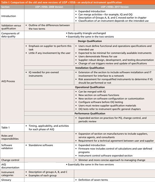 Proposed drafts of the new version were published for public comment in Pharmacopeial Forum in 2015 (9) and 2016 (10) and comments were incorporated in the updated versions. The approved USP <1058> final version was published in January 2017 in the First Supplementto USP 40 (11). The chapter became effective on August 1, 2017. There was an erratum published in February, but the only change was reference of the operational qualification (OQ) testing to the intended use definition (user requirements specification [URS]).