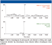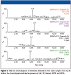 Samples of river water were screened for the same compound classes as for the drinking water sample discussed earlier in this article. Of the 12 phenoxyacetic acids tested, four were present in this river source. The total ion chromatogram data for the detected herbicides are shown in Figure 5. As seen in the figure, 2,4,5 TP, dinoseb, MCPP, and MCPA were present in the river water. They were detected at the 10–50 ppt range. These results illustrate the utility of the water analysis system for the analysis of organics in water sources that present a more challenging matrix than drinking water. Any samples containing solids must be filtered before their injection in the system because, as expected, the presence of solids in the injected sample can clog the sample preparation cartridge over time.