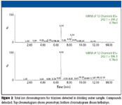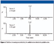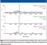 A total of 12 triazines, a class of pesticides used for insect management in agriculture, were screened for in this drinking water source also. The total ion chromatogram of the two pesticides that gave positive signals are shown in Figure 2. Both compounds, prometryn and terbytryn, were detected at the 10-ppt range.
