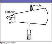 In 1895, Röntgen (Figure 1) was at the University of Wurzburg, Germany, experimenting with gaseous discharge tubes (Figure 2). When a high voltage is applied to the electrodes of a partially evacuated glass tube, a glow is observed. Back in 1838, Michael Faraday described the bright regions near the electrodes with a dark region in between (Faraday dark space). Later, physicist Johann Hittorf (1824–1914) observed glowing rays extending from the negative electrode to produce a fluorescent glow where they struck the glass walls. These were named "cathode rays" by Eugene Goldstein (1850–1931). Sir William Crookes (1832–1919) demonstrated that cathode rays could cast shadows of objects, turn a small wheel in their path, and be deflected by a magnet. In 1892, physicist Heinrich Hertz (1857–1894) showed that these rays could penetrate very thin metal foil. Röntgen, however, was to discover a different kind of ray.